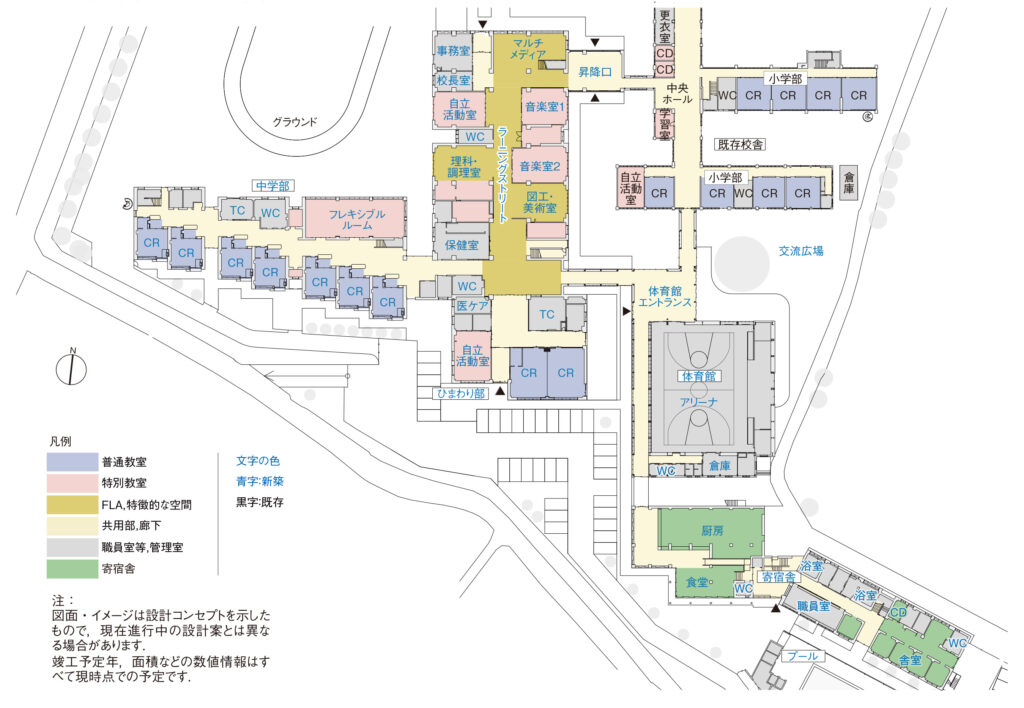 知的障がいを持つ小学生、中学生、高校生のための特別支援学校である。既存校舎の半分ほどを建て替え、また、残す校舎も一部を改修して、全体を新しい学びの場として再編する。